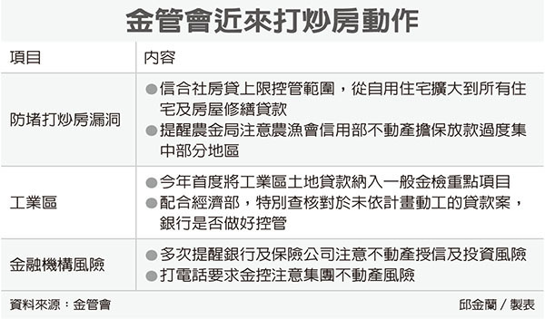 金管会打炒房行动扩及信合社,将信合社办理房贷额度的控管范围,从原本只有自用住宅贷款,扩大到所有住宅贷款及房屋修缮贷款,两者合计不能超过存款的55% ,以利信合社做好房贷业务的风险控管。