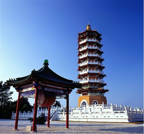 塔高耸入天,俨然成为日月潭著名的地标建筑。从慈恩塔最高层往拉鲁岛(原名光华岛)瞭望,拉鲁岛、玄奘寺与慈恩塔,约在同一条中轴线上,地形宛若是龙头伸入潭中取水,拉鲁岛位于